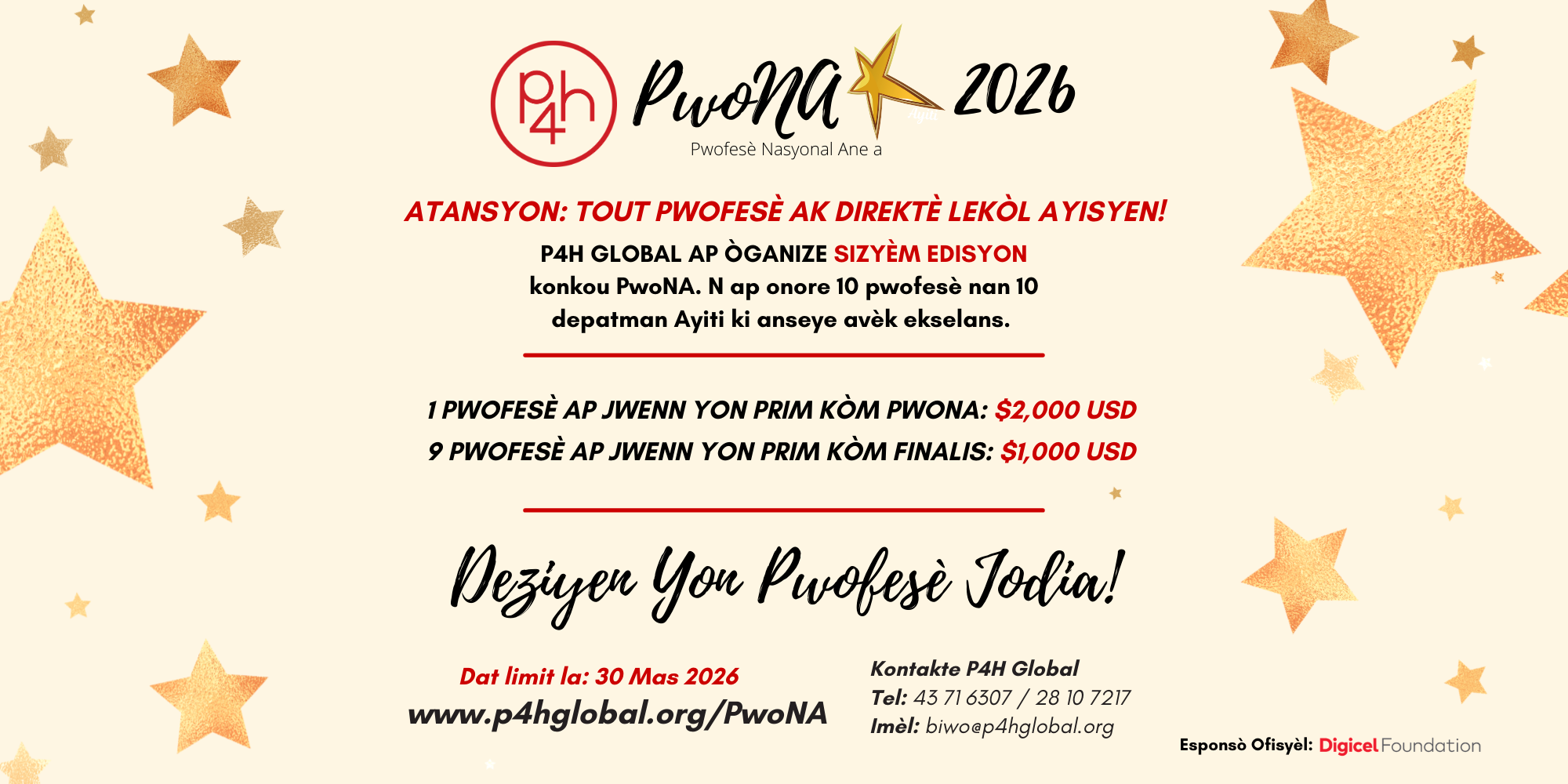 Haiti’s National Teacher of the Year (PwoNA) program serves as a way to highlight the significant contributions of Haitian teachers in Haiti’s development. After receiving nominations, an expert panel of judges from MIT, the University of Quisqueya (InnovEd), the Ministry of Education, the International University of Hispaniola, the University of Florida, and P4H Global identify 10 outstanding finalists. Finally, after analyzing CVs, essays, letters of recommendations, teaching videos, lesson plans, student test scores, and other supporting documentation, the judges select the National Teacher of the Year, announced at our annual National Teacher of the Year Award Ceremony.